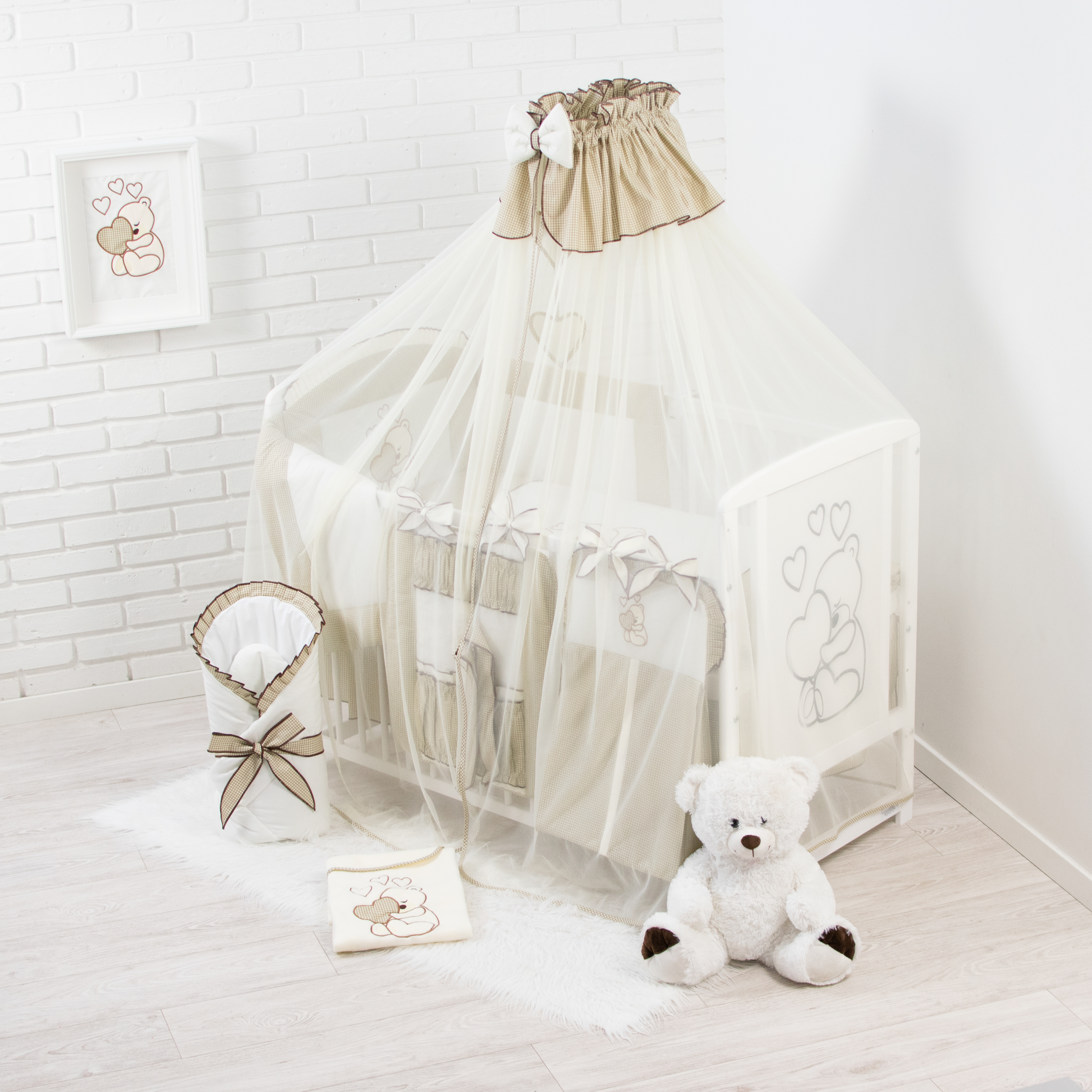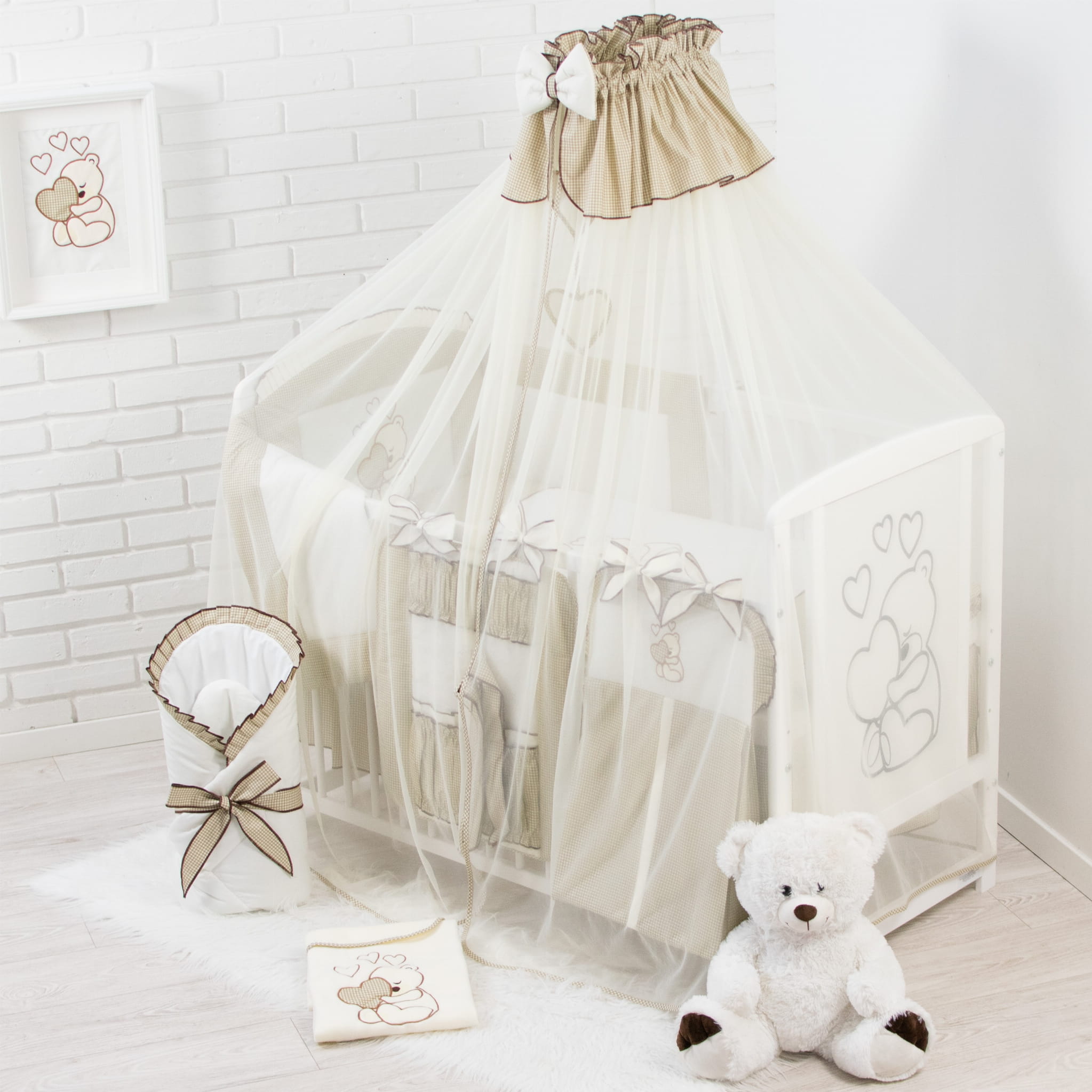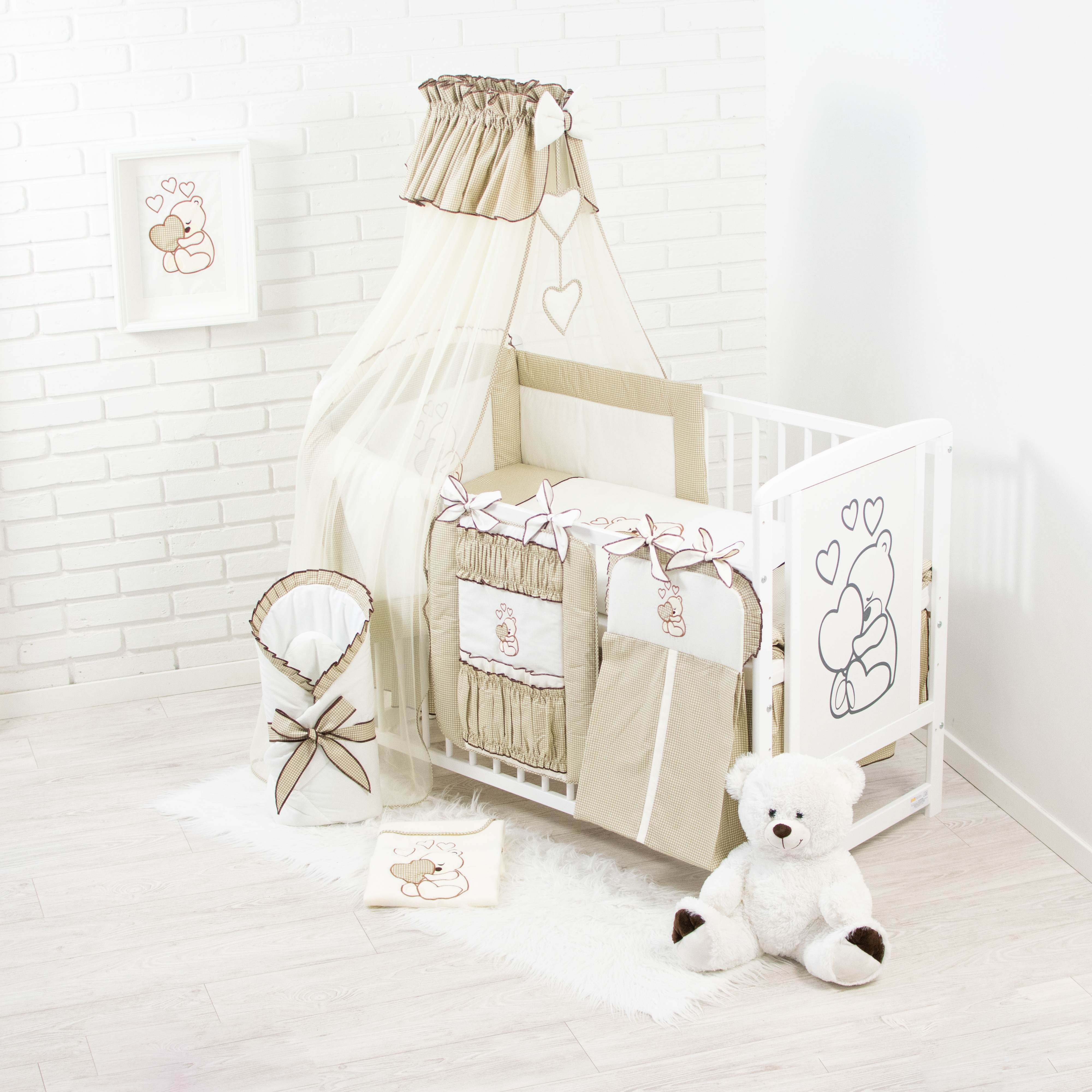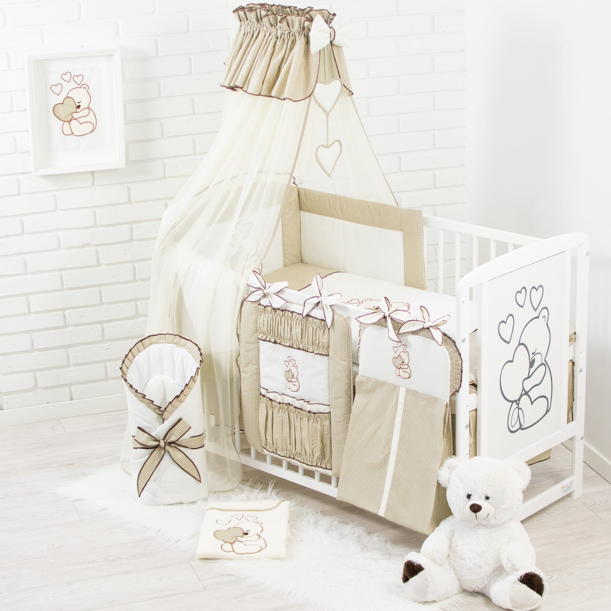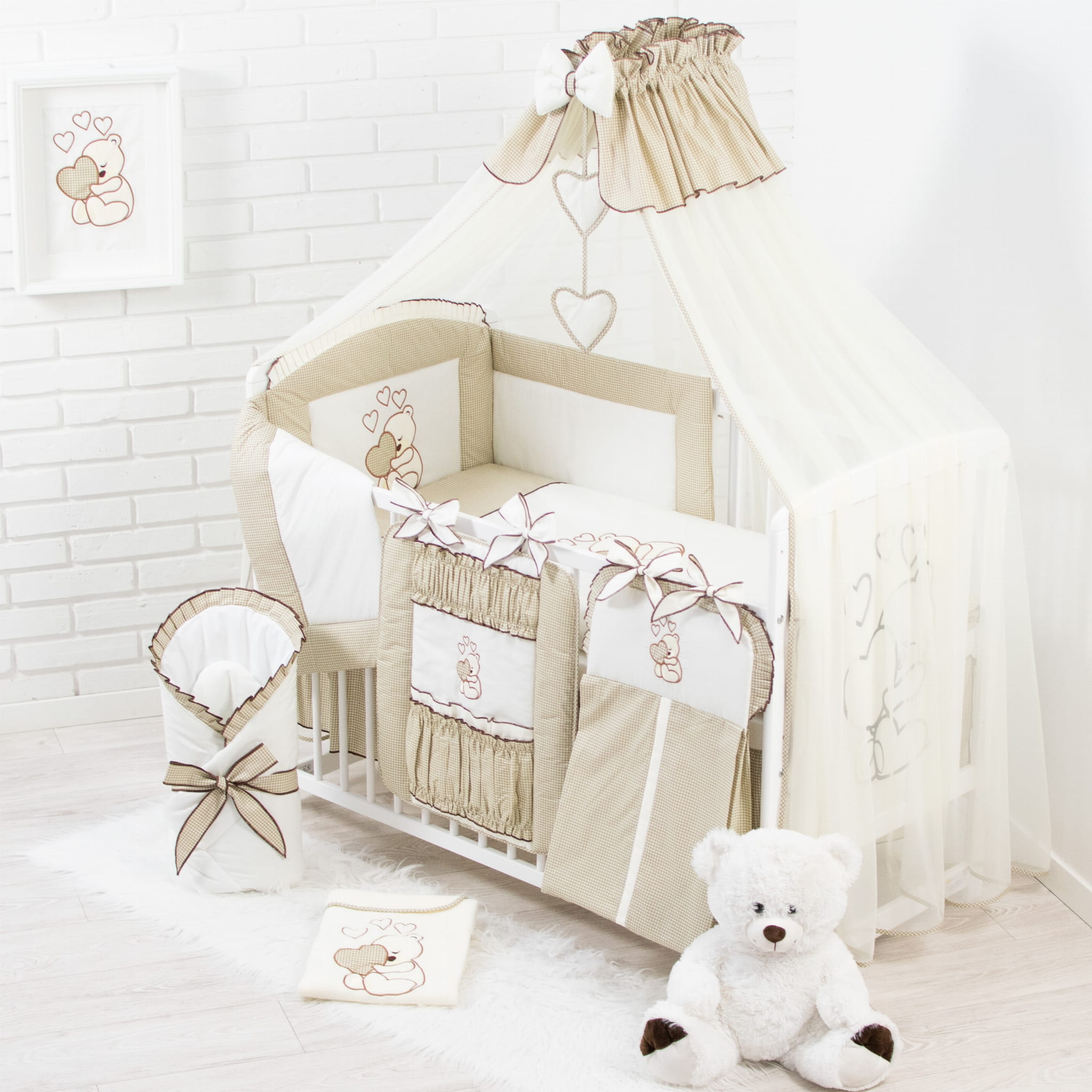 16 Teiliges Babybettwäsche Set bestickt mit einem Teddybären mit Herz inkl. Betthimmel Dunkelbeige