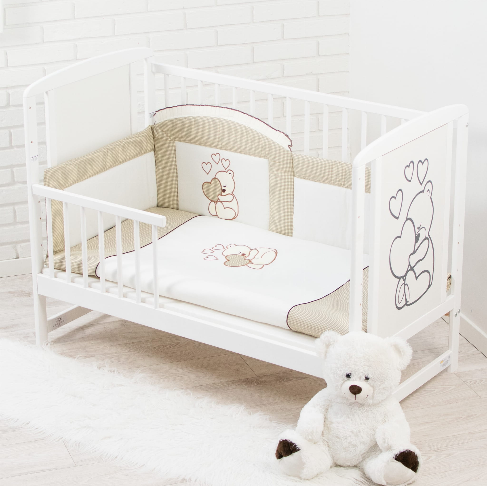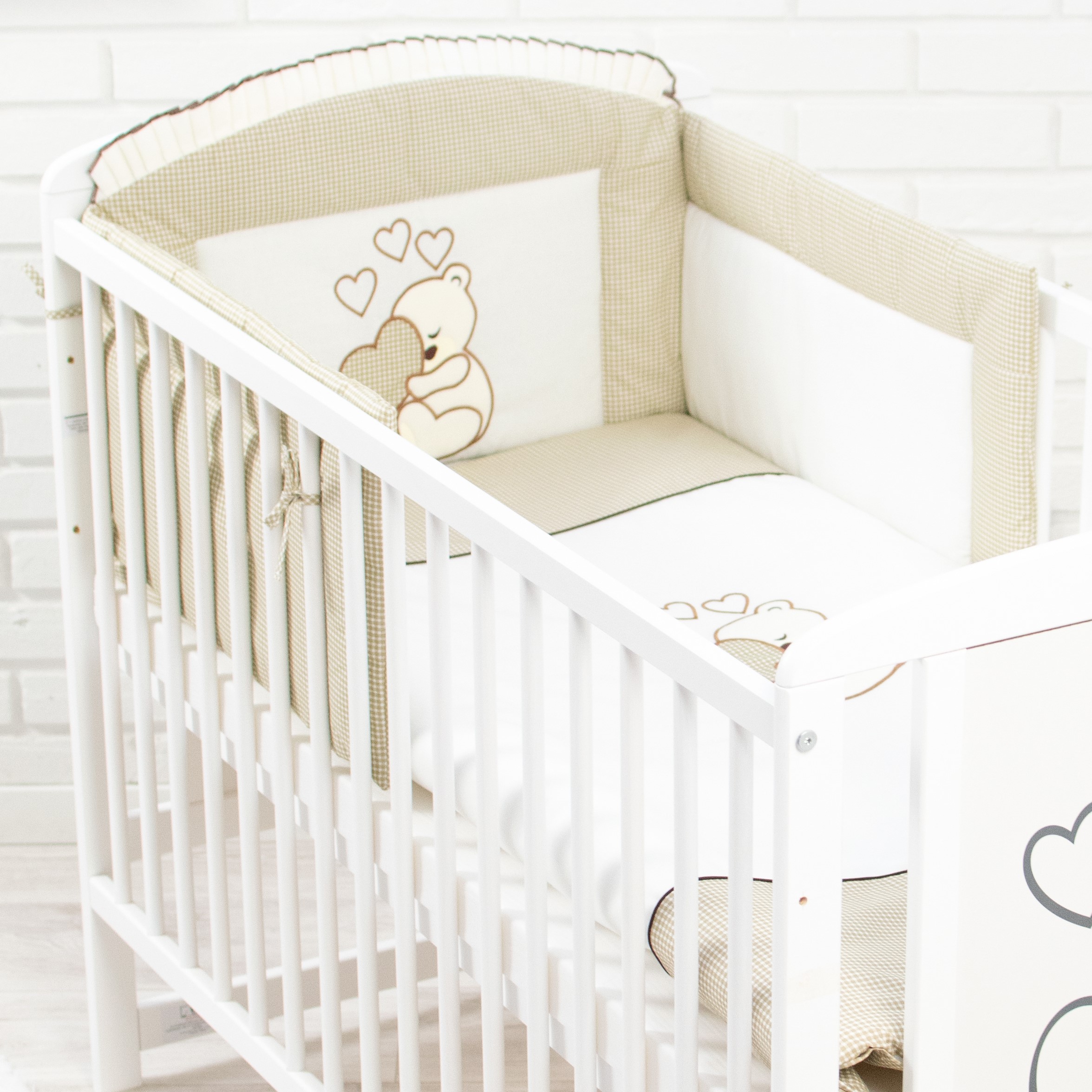 3. Die Bettumrandung ist ebenfalls eine Kombination aus zwei Baumwollstoffen bestickt mit einem "Teddybären mit Herz", sie schützt Ihr Kind vor Zugluft, verhindert, dass es beim Spielen gegen die Sprossen stößt und bietet Ihrem Liebsten im Bett ein schönes Ambiente.